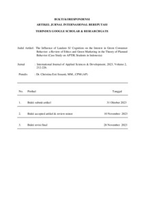 Susanti, Christina Esti, Suwito, Benny, Handayani, Wahyu Prabawati Putri, Tresyanto, Citra Anggraini and Octavia, Cecilia Dwi (2023) The Influence of Laudato Si' Cognition on the Interest in Green Consumer Behavior: a Review of Ethics and Green Marketing in the Theory of Planned Behavior (Case Study on APTIK Students in Indonesia). International Journal Of Applied Sciences & Development, 2. pp. 212-226. ISSN 2945-0454