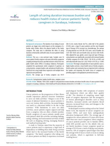 Werdani, Yesiana Dwi Wahyu (2020) Length of caring duration increases burden and reduces health status of cancer patients’ family caregivers in Surabaya, Indonesia. Length of caring duration increases burden and reduces health status of cancer patients’ family caregivers in Surabaya, Indonesia, 8 (1). pp. 53-59. ISSN 2503-2356