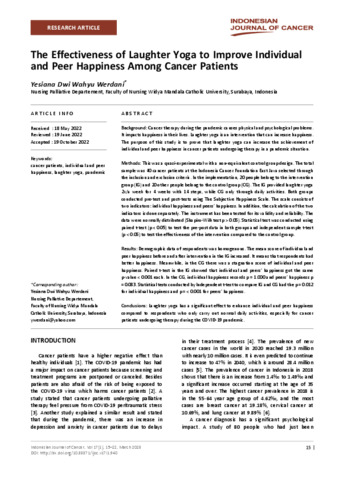 Werdani, Yesiana Dwi Wahyu (2023) The Effectiveness of Laughter Yoga to Improve Individual and Peer Happiness Among Cancer Patients. The Effectiveness of Laughter Yoga to Improve Individual and Peer Happiness Among Cancer Patients, 17 (1). pp. 15-22. ISSN 2355-6811