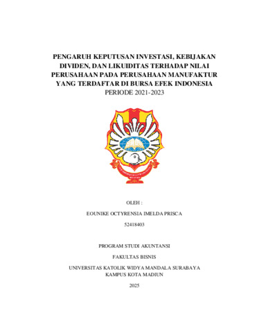 Prisca, Eounike Octyrensia Imelda (2025) Pengaruh keputusan investasi, kebijkan dividen, dan likuiditas terhadap nilai perusahaan pada Perusahaan Manufaktur yang terdaftar di Bursa Efek Indonesia periode 2021-2023. Undergraduate thesis, Widya Mandala Surabaya Catholic University.