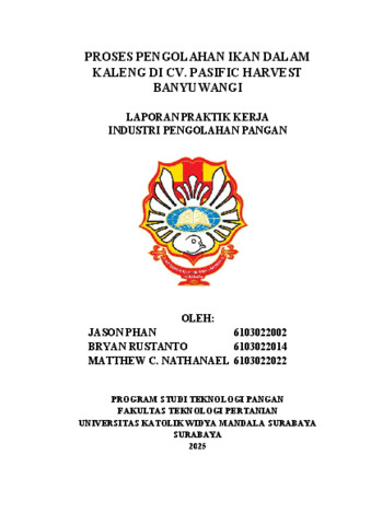 Phan, Jason, Rustanto, Bryan and Nathanael, Matthew Christian (2025) Proses pengolahan ikan dalam kaleng di CV. Pasific Harvest Banyuwangi. Project Report (PKL, PKIPP, Magang D3, Praktik Kerja Profesi Apoteker, Profesi Guru, Profesi Ners dan Profesi Insiyur). Faculty of Agricultural Technology, Surabaya. (Submitted)