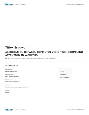 Arjuna, Sansan Rollens, Ernawati, Titiek and Djaputra, Edith Maria (2020) Association between computer vision syndrome and attention in workers. Journal of Widya Medika Junior, 2 (2). pp. 125-129. ISSN eISSN: 2656-1409