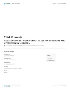 Introduction: Nowadays, digital devices are rapidly growing and demanding everybody to use a computer or laptop for daily life, such as working, studying, playing games. Generally, the eye problem goes parallel with the growth of technology. Eyes problem related to the use of the computer, such as dry eyes, tired eyes, blurred eyes, and it is called Computer Vision Syndrome (CVS). Attention is a process that restricts much information that needs to be received and has a vital role in maintaining cognitive function. Attention is affected by the sensory stimulus, especially from the eyes. That is why CVS might influence attention. If the attention becomes distracted, it will affect studying or working performance. Aim: To analyze the association between CVS and attention in Workers. Methods: Cross-sectional is used in this research, and the sampling method was consecutive sampling. Computer Vision Syndrome Questionnaire and Trail Making Test part B is the instrument for this research Result: Respondents with CVS was 59,2%, disturbed attention was 63,2%, both CVS and disturbed attention was 40,8%. Chi-square trial showed p=0,110, which means that there is no association between CVS and attention. Conclusion: There is no association between CVS and attention in Workers.