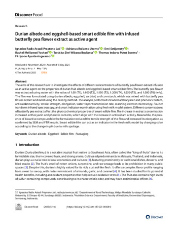 Jati, Ignasius Radix A.P., Utomo, Adrianus Rulianto, Setijawaty, Erni, Yoshari, Rachel Meiliawati, Budianta, Tarsisius Dwi Wibawa, Suseno, Thomas Indarto Putut and Ayustaningwarto, Fitriyono Durian albedo and eggshell‑based smart edible film with infused butterfly pea flower extract as active agent. Discover Food.