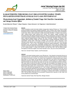 Tempe merupakan produk fermentasi kedelai menggunakan kapang Rhizopus sp. Tempe memiliki komponen bioaktif yang berperan sebagai antioksidan, namun memiliki masa simpan yang pendek. Pengolahan tempe menjadi sambal tempe dapat memperpanjang masa simpan serta meningkatkan fungsi tempe. Bahan utama pembuatan sambal tempe pada penelitian ini meliputi tempe goreng, cabe, rempah-rempah (cabai, bawang putih, kencur), dan angkak. Angkak merupakan hasil fermentasi beras oleh kapang Monascus purpureus. Selama penyimpanan, komponen lemak pada sambal tempe dapat mengalami oksidasi. Penggunaan angkak dapat bertindak sebagai antioksidan, selain fungsinya sebagai pewarna makanan dan flavor enhancer. Penelitian ini bertujuan untuk mengkaji efek konsentrasi angkak dan lama penyimpanan terhadap karakteristik fisikokimia dan organoleptik sambal tempe. Rancangan penelitian yang digunakan adalah Rancangan Acak Kelompok desain faktorial, yaitu konsentrasi angkak (0%; 0,2%; 0,4%; 0,6%; dan 0,8%) dan lama penyimpanan (0, 7, dan 14 hari). Peningkatan konsentrasi angkak berpengaruh nyata terhadap parameter warna, dan penerimaan organoleptic terhadap warna, aroma, dan rasa sambal tempe. Interaksi konsentrasi angkak dan lama penyimpanan berpengaruh nyata terhadap angka peroksida (0-1,42 meq/kg sampel), % inhibisi 28,47-83,05%, dan total fenol 2,05-11,89 mg GAE/g sampel. Peningkatan konsentrasi angkak menurunkan kesukaan warna, rasa, dan aroma sambal tempe.