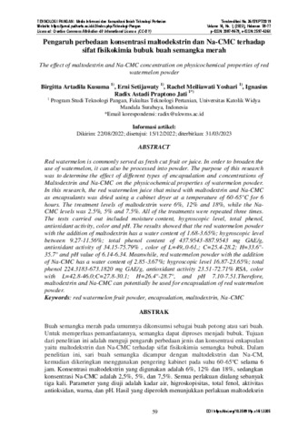 Kusuma, Birgitta Artadila, Setijawaty, Erni, Yoshari, Rachel Meiliawati and Jati, Ignasius Radix Astadi Praptono Pengaruh perbedaan konsentrasi maltodekstrin dan Na-CMC terhadap sifat fisikokimia bubuk buah semangka merah. TEKNOLOGI PANGAN : Media Informasi dan Komunikasi Ilmiah Teknologi Pertanian.