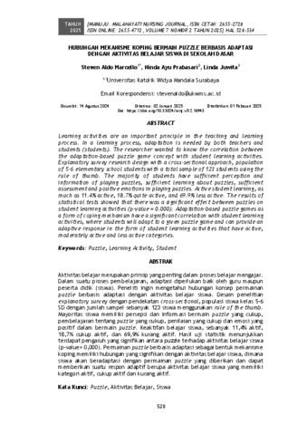 Marcello, Steven Aldo, Prabasari, Ninda Ayu and Juwita, Linda HUBUNGAN MEKANISME KOPING BERMAIN PUZZLE BERBASIS ADAPTASI DENGAN AKTIVITAS BELAJAR SISWA DI SEKOLAH DASAR. MANUJU: MALAHAYATI NURSING JOURNAL,.