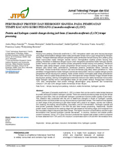 Kacang koro pedang (Canavalia ensiformis (L.) DC) merupakan salah satu jenis kacang-kacangan yang dapat dimanfaatkan sebagai bahan baku pembuatan tempe namun juga mengandung hidrogen sianida. Terdapat beberapa tahapan pengolahan pada pembuatan tempe kacang koro pedang yang dapat menurunkan kadar hidrogen sianida namun meningkatkan kualitas protein kacang koro pedang. Penelitian ini dilakukan dengan tujuan untuk mengetahui perubahan kadar hidrogen sianida, protein terlarut dan protein total selama proses pengolahan tempe kacang koro pedang. Perlakuan diberikan pada setiap tahapan proses pengolahan tempe kacang koro pedang dengan total enam tahapan yaitu bahan baku, perendaman, perebusan pertama, perebusan kedua, inokulasi, dan fermentasi. Variasi konsentrasi inokulum dan lama fermentasi juag dikaji dalam penelitian ini. Hasil penelitian menggambarkan kadar hidrogen sianida dan total protein menurun sejalan dengan proses pengolahan tempe kacang koro pedang. Kadar protein terlarut meningkat pada tahap perendaman kemudian menurun pada tahap perebusan dan meningkat dari tahap inokulasi hingga menjadi tempe kacang koro pedang. Seiring meningkatnya konsentrasi inokulum dan waktu fermentasi menurunkan kadar hidrogen sianida namun meningkatkan kadar air dan protein terlarut. Penggunaan inokulum 1,5% (b/b) menghasilkan total protein tertinggi dibandingkan yang diperoleh dari konsentrasi inokulum 1,0% dan 2,0% dengan waktu fermentasi 24 dan 48 jam.