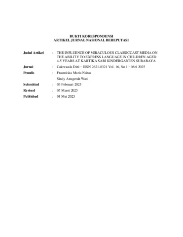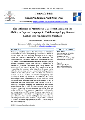 Nahas, Fransiska Maria and Wati, Sindy Anugerah The Influence of Miraculous Classiccast Media on the Ability to Express Language in Children Aged 4-5 Years at Kartika Sari Kindergarten Surabaya. Cakrawala Dini: Jurnal Pendidikan Anak Usia Dini.