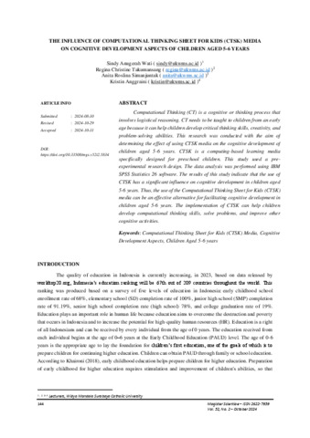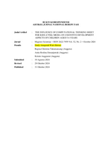 Wati, Sindy Anugerah, Takumansang, Regina Christine, Simanjuntak, Anita Roslina and Anggraini, Kristin THE INFLUENCE OF COMPUTATIONAL THINKING SHEET FOR KIDS (CTSK) MEDIA ON COGNITIVE DEVELOPMENT ASPECTS OF CHILDREN AGED 5-6 YEARS. Magister Scientiae.