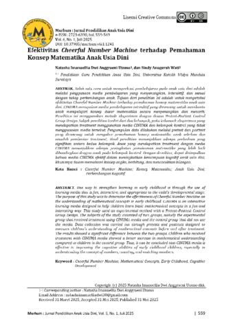 Sa/ah satu cara untuk memperkuat pembelajaran pada anak usia dini adalah melalui penggunaan media pembelajaran yang menyenangkan, interaktif, dan sesuai dengan tahap perkembangan anak. Tujuan dari penelitian ini adalah untuk mengetahui efektivitas Cheerful Number Machine terhadap pemahaman konsep matematika anak usia dini. CINUMA merupakan media pembelajaran interaktifyang dirancang untuk membantu anak mempelajari konsep dasar matematika secara menyenangkan dan menarik. Penelitian ini menggunakan metode eksperimen dengan desain Pretest-Posttest Control Group Design. Subjek penelitian terdiri dari dua kelompok,yaitu kelompok eksperimenyang mendapatkan treatment menggunakan media CINUMA dan kelompok kontrol yang tidak menggunakan media tersebut. Pengumpulan data dilakukan melalui pretest dan posttest yang dirancang untuk mengukur pemahaman konsep matematika anak sebelum dan sesudah pemberian treatment. Hasil penelitian menunjukkan adanya perbedaan yang signifikan antara kedua kelompok. Anak yang mendapatkan treatment dengan media CINUMA menunjukkan adanya peningkatan pemahaman matematika yang lebih baik dibandingkan dengan anak pada kelompok kontrol. Dengan demikian, dapat disimpulkan bahwa media CINUMA efektif dalam meningkatkan kemampuan kognitif anak usia dini, khususnya dalam memahami konsep angka, berhitung, dan mencocokkan bilangan.