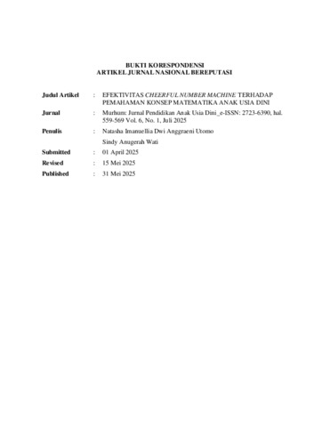 Utomo, Natasha Imanuellia Dwi Anggraeni and Wati, Sindy Anugerah Efe tivitas Cheerful Number Machine terhadap Pemahaman Konsep Matematika Anak Usia Dini. Murhum : Jurnal Pendidikan Anak Usia Dini.