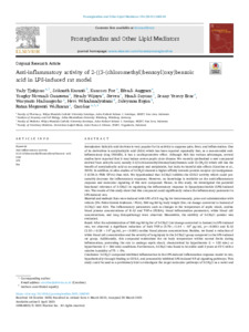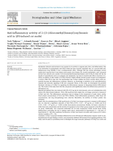 Introduction: Salicylic acid derivate is very popular for its activity to suppress pain, fever, and inflammation. One of its derivatives is acetylsalicylic acid (ASA) which has been reported repeatedly that, as a non-steroidal anti- inflammatory drug (NSAID), it has a cardioprotective effect. Although ASA has various advantages, several studies have reported that it may induce severe peptic ulcer disease. We recently synthesized a new compound derived from salicylic acid, namely 2-((3-(chloromethyl)benzoyl)oxy)benzoic acid (3-CH Cl) which still has the benefit of acetylsalicylic acid as an analgesic and antiplatelet, but lacks its harmful side effects (Caroline et al., 2019). In addition, in silico studies of 3-CH 22 Cl showed a higher affinity towards protein receptor cyclooxygenase-2 (COX-2; PDB: 5F1A) than ASA. We hypothesized that 3-CH Cl inhibits the COX-2 activity which could presumably decrease the inflammatory responses. However, no knowledge is available on the anti-inflammatory response and molecular signaling of this new compound. Hence, in this study, we investigated the potential functional relevance of 3-CH22 Cl in regulating the inflammatory response in lipopolysaccharide (LPS)-induced rats. The results of this study show that this compound could significantly reduce the inflammatory parameter in LPS-induced rats. Material and methods: Rats were induced with LPS of 0.5 mg/kg bw intravenously, prior oral administration with vehicle (3% Pulvis Gummi Arabicum / PGA), 500 mg/60 kg body weight (bw; rat dosage converted to human) of 3-CH Cl and ASA. The inflammatory parameters such as changes in the temperature of septic shock, cardiac blood plasma concentrations of IL-1β and TNFα (ELISA), blood inflammation parameters, white blood cell concentrations, and lung histopathology were observed. Meanwhile, the stability of 3-CH 2 Contents lists available at ScienceDirect Prostaglandins and Other Lipid Mediators journal homepage: www.elsevier.com/locate/prostaglandins Cl powder was evaluated. Result: After the administration of 500 mg/60 kg bw of 3-CH Cl (rat dosage converted to human) to LPS-induced rats, we observed a significant reduction of both TNFα (5.70+/-1.04 × 10 (2.32+/-0.28 × 10 3 23 2pg/mL, p=<0.001) and IL-1β pg/mL, p=<0.001) cardiac blood plasma concentrations. Besides, we found a reduction of white blood cell concentration and the severity of lung injury in the 3-CH Cl group compared to the LPS-induced rat group. Additionally, this compound maintained the rat body temperature within normal limits during inflammation, preventing the rats to undergo septic shock, characterized by hypothermic (t = 120 min.) or hyperthermic (t = 360 min) conditions. Furthermore, 3-CH 22Cl was found to be stable until 3 years at 25 C with a relative humidity of 75 ± 5%. Conclusion: 3-CH Cl compound inhibited inflammation in the LPS-induced inflammation response model in rats, hypothetically through binding to COX-2, and presumably inhibited LPS-induced NF-κβ signaling pathways. This study could be used as a preliminary hint to investigate the target molecular pathways of 3-CH2Cl as a novel and less toxic therapeutical agent in alleviating the COX-related inflammatory diseases, and most importantly to support the planning and development of clinical trial.