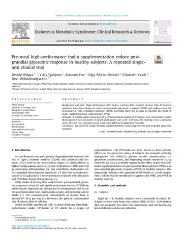 Wijaya, Hendy, Tjahjono, Yudy, Foe, Kuncoro, Setiadi, Diga Albrian, Kasih, Elisabeth and Wihadmadyatamib, Hevi (2022) Pre-meal high-performance inulin supplementation reduce post-prandial glycaemic response in healthy subjects: A repeated single-arm clinical trial. Diabetes & Metabolic Syndrome: Clinical Research & Reviews, 16 (1). p. 102354. ISSN pISSN: 18714021, eISSN: 18780334