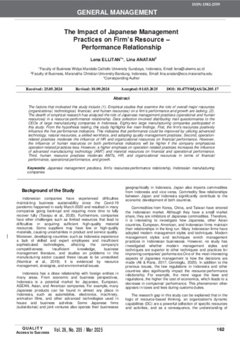 Ellitan, Lena and Anatan, Lina The Impact of Japanese Management Practices on Firm’s Resource –Performance Relationship. Quality – Access to Succes, 26 (205). ISSN 1582-2559