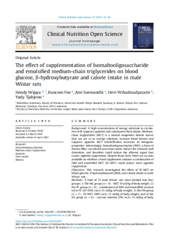 Wijaya, Hendy, Foe, Kuncoro, Soewandhi, Ami, Wihadmadyatami, Hevi and Tjahjono, Yudy (2021) The effect of supplementation of isomaltooligosaccharide and emulsified medium-chain triglycerides on blood glucose, -hydroxybutyrate and calorie intake in male Wistar rats. Clinical Nutrition Open Science, 37. pp. 35-46. ISSN 26672685