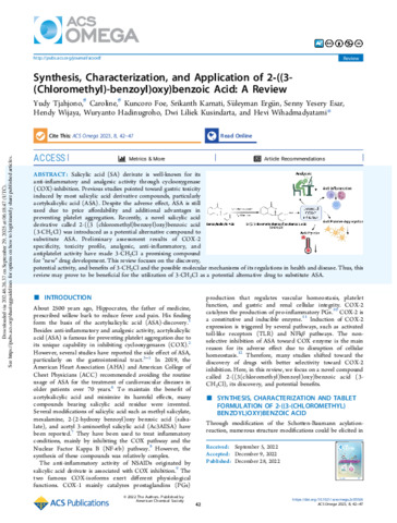 Tjahjono, Yudy, Caroline, Caroline, Foe, Kuncoro, Karnati, Srikanth, Ergün, Süleyman, Esar, . Senny Yesery, Wijaya, Hendy, Hadinugroho, Wuryanto, Kusindarta,, Dwi Liliek and Wihadmadyatamib, Hevi (2023) Synthesis, characterization, and application of 2-((3-(chloromethyl)-benzoyl)oxy)benzoic acid: A review. ACS Omega, 8 (1). pp. 42-47. ISSN 24701343