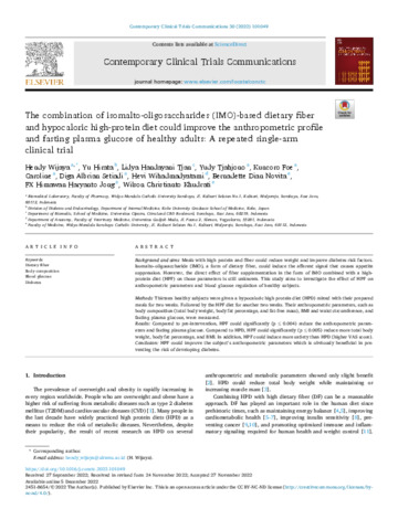 Wijaya, Hendy, Hirata, Yu, Tjan, Lidya Handayani, Tjahjono, Yudy, Foe, Kuncoro, Caroline, Caroline, Setiadi, Diga Albrian, Wihadmadyatami, Hevi, Novita, Bernadette Dian, Jong, FX. Himawan Haryanto and Khudrati, Wilson Christianto (2022) The combination of iso-malto oligosaccharides (IMO)-based dietary fiber and hypocaloric high-protein diet could improve the anthropometric profile and fasting plasma glucose of healthy adults: A repeated single-arm clinical trial. Contemporary Clinical Trials Communications, 30. e101049. ISSN 2451-8654