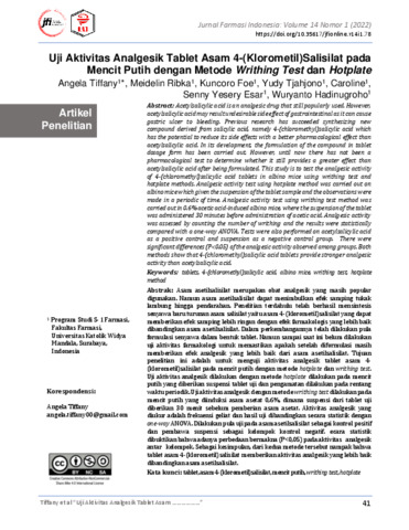 Tiffany, Angela, Ribka, Meidelin, Foe, Kuncoro, Tjahjono, Yudy, Caroline, Caroline, Esar, . Senny Yesery and Hadinugroho, Wuryanto (2022) Uji aktivitas analgesik tablet asam 4-(klorometil)salisilat pada mencit putih dengan metode Writhing test dan hotplate. Jurnal Farmasi Indonesia, 14 (1). pp. 41-50. ISSN pISSN: 14121107, eISSN: 2355696X