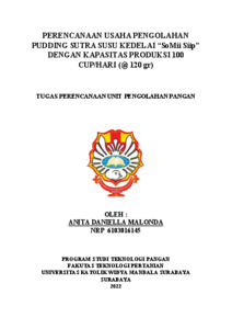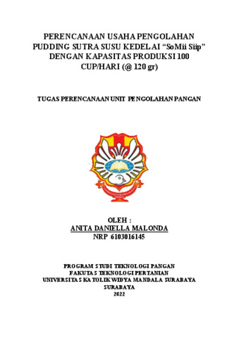 Malonda, Anita Daniella (2022) Perencanaan usaha pengolahan pudding sutra susu kedelai “SoMii Siip” dengan kapasitas produksi 100 cup/hari (@ 120 gr). Technical Report (Perencanaan Unit Pengolahan Pangan (FTP), Makalah Komprehensif (FTP)). Faculty of Agricultural Technology, Surabaya. (Submitted)