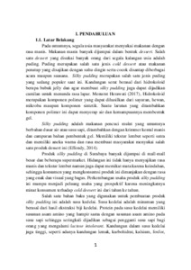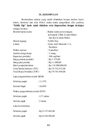 Makanan penutup di dunia memiliki aneka jenis dan rasa, serta digemari oleh banyak kalangan masyarakat salah satunya adalah puding. Puding pada umumnya memiliki rasa yang manis, bertekstur lembut dan beraneka warna. Namun, puding yang dijual pada umumnya menggunakan susu sapi sebagai bahan dasar dalam pembuatannya, sehingga konsumen yang memiliki gangguan intoleransi laktosa tidak dapat menikmati puding dengan bahan dasar susu sapi. untuk meningkatkan daya tarik konsumen, ditambahkan saus sebagai penambah citarasa pada puding sutra. Produk dengan nama dagang “SoMii Siip” menggunakan bahan dasar susu kacang kedelai yang akan diproduksi dengan kapasitas 100 cup @120 gram/hari. Tempat usaha “SoMii Siip” terletak di jl. Amir Hamzah 2-A, Surabaya. Bentuk badan usaha berupa badan usaha perseorangan dengan skala produksi rumah tangga yang tergolong dalam kelompok UMKM dengan struktur organisasi lini/garis dengan 2 orang karyawan. Bahan baku yang digunakan adalah susu kacang kedelai, gula pasir, campuran bubuk hidrokolid, dan perisa vanilli. Tahapan proses pengolahan ”SoMii Siip”, yaitu pembuatan susu kedelai, pembuatan silky pudding dan pembuatan saus. Kemasan yang digunakan untuk puding sutra berupa cup plastik dengan tutup yang memiliki volume 150ml, kemudian untuk kemasan saus menggunakan plastic clip uk. 4x6 cm. Nilai Rate of Return sebelum pajak sebesar 11,47% dan setelah pajak sebesar 10,69%. Lama Pay Out Time sebelum pajak selama 4,71 tahun dan setelah pajak selama 5 tahun. Nilai Titik Impas / Break Even Point sebesar 24,33 % / 2628 unit / Rp 28.907.374,00