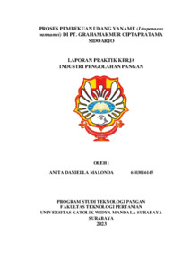 Malonda, Anita Daniella (2023) Proses pembekuan udang Vaname (Litopenaeus vannamei) di PT. Grahamakmur Ciptapratama Sidoarjo. Project Report (PKL, PKIPP, Magang D3, Praktik Kerja Profesi Apoteker, Profesi Guru, Profesi Ners dan Profesi Insiyur). Faculty of Agricultural Technology, Surabaya. (Submitted)