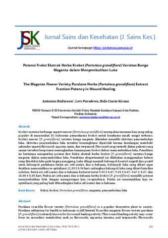 Krokot varietas berbunga seperti mawar (Portulaca grandiflora) merupakan tanaman hias yang cukup populer di masyarakat. Di Indonesia pemanfaatan krokot untuk kesehatan masih sangat terbatas. Krokot mawar (P. grandiflora) varietas bunga magenta diketahui memiliki aktivitas penyembuhan luka. Aktivitas penyembuhan luka tersebut kemungkinan diperoleh karena kandungan metabolit sekunder seperti flavonoid, saponin, tanin, dan terpenoid. Flavonoid yang tertarik dalam pelarut yang sesuai tersebut berpotensi meningkatkan kemampuan krokot dalam menyembuhkan luka. Penelitian ini bertujuan mengetahui potensi dari fraksi ekstrak herba krokot (P. grandiflora) varietas bunga magenta dalam menyembuhkan luka. Penelitian eksperimental ini dilakukan menggunakan kelinci yang diinduksi luka pada bagian punggung. Luka dibagi menjadi kelompok kontrol negatif dan positif serta kelompok perlakuan fraksi air, etil asetat, dan n-heksana. Kelompok luka yang diberi aqua destilata menunjukkan re-epitelisasi 12.33 ± 0.94 hari, sedangkan kelompok luka yang diberi betadine solution, fraksi air, etil asetat, dan n-heksana berturut-turut 9.33 ± 0.47, 9.33 ± 0.47, 9.67 ± 0.47, dan 10.00 ± 0.00 hari. Fraksi air, etil asetat, dan n-heksana herba krokot (P. grandiflora) memiliki potensi menyembuhkan luka dengan mempercepat laju re-epitelisasi. Fraksi air menunjukkan laju reepitelisasi yang paling baik dibandingkan fraksi etil asetat dan n-heksana.
