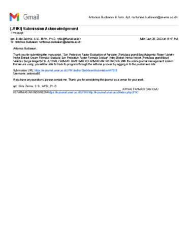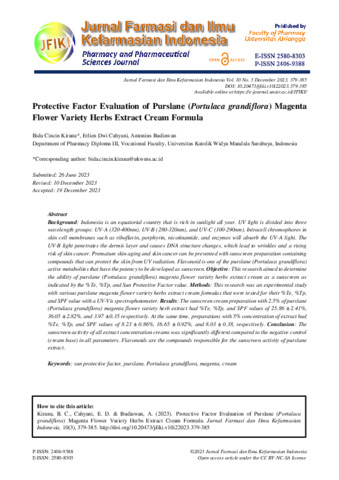Kirana, Bida Cincin (2023) Protective factor evaluation of purslane (Portulaca grandiflora) magenta flower variety herbs extract cream formula. Jurnal Farmasi dan Ilmu Kefarmasian Indonesia, 10 (3). pp. 379-385. ISSN p-ISSN: 2406-9388; e-ISSN: 2580-8303