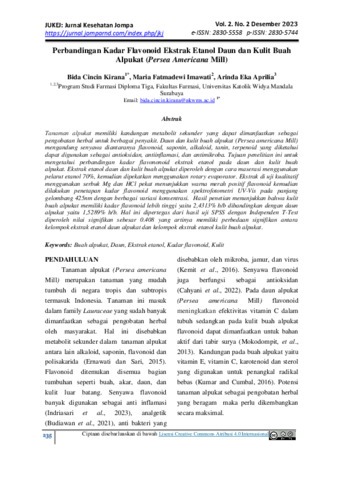 Kirana, Bida Cincin (2023) Perbandingan kadar flavonoid ekstrak etanol daun dan kulit buah alpukat (Persea Americana Mill). JUKEJ: Jurnal Kesehatan Jompa, 2 (2). pp. 235-239. ISSN p-ISSN: 2830-5744; e-ISSN: 2830-5558