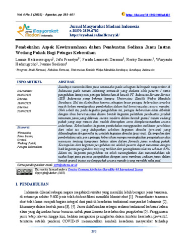 Hadisoewignyo, Lannie, Prasetyo, Jefri, Darsono, Farida Lanawati, Sinansari, Restry, Hadinugroho, Wuryanto and Soeliono, Ivonne (2025) Pembekalan Aspek Kewirausahaan dalam Pembuatan Sediaan Jamu Instan Wedang Pokak Bagi Petugas Kebersihan. Jurnal Masyarakat Madani Indonesia, 4 (3). pp. 393-401. ISSN e-ISSN: 2829-6702