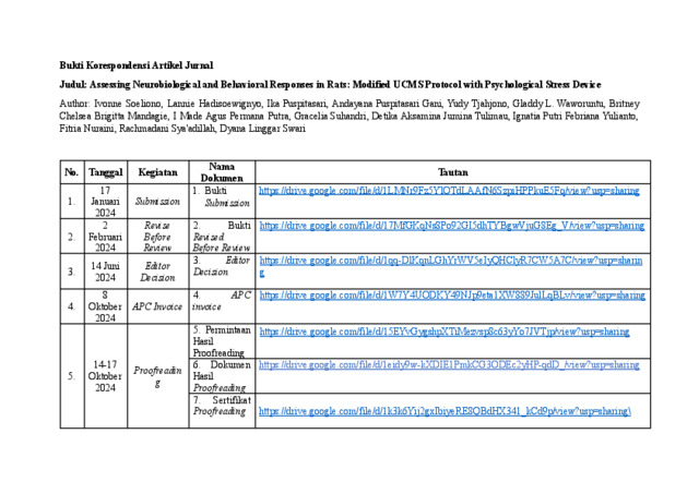 Soeliono, Ivonne, Hadisoewignyo, Lannie, Puspitasari, Ika, Gani, Andayana Puspitasari, Tjahjono, Yudy, Waworuntu, Gladdy, Mandagie, Britney Chelsea Brigitta, Putra, I Made Agus Permana, Suhandri, Gracelia, Tulimau, Detika Aksamina Jumina, Yulianto, Ignatia Putri Febriana, Nuraini, Fitria, Sya'adillah, Rachmadani and Swari, Dyana Linggar (2025) Evaluating the Impact of a Modified UCMS Protocol with a Psychological Stress Device on Neurobiological and Behavioral Responses in Rats. Indonesian Journal of Pharmacy. ISSN 2338-9486 (electronic) 2338-9427 (printed) (In Press)