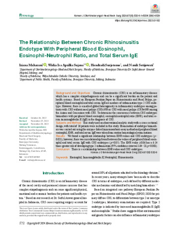 Maharani, Iriana, Sujana, Widia Isa Aprillia, Surjotomo, Hendradi and Maharani, Nanik Setijowati Iriana (2024) The Relationship Between Chronic Rhinosinusitis Endotype With Peripheral Blood Eosinophil, Eosinophil-Neutrophil Ratio, and Total Serum IgE. Korean Journal Otorhinolaryngol-Head Neck Surgery, 67 (10). pp. 532-539. ISSN 20926529