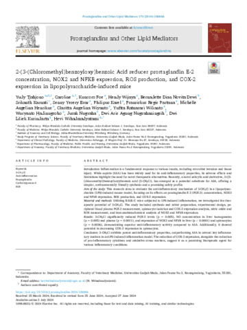Tjahjono, Yudy, Caroline, Caroline, Kuncoro, Foe, Hendy, Wijaya, Dewi, Bernadette Dian Novita, Karnati, Srikanth, Esar, Senny Yesery, Karel, Philipus, Partana, Fransiskus Regis, Hericus, Michelle Angelina, Hadinugroho, Wuryanto and Nugraha, Jusak (2024) 2-((3-(Chloromethyl) benzoyloxy) benzoic Acid reduces prostaglandinE-2 concentration, NOX2 and NFK Bexpression, ROS production, and COX-2 expression in lipopolysaccharide-induced mice. Prostaglandins and Other Lipid Mediators, 174. ISSN 1908-8823