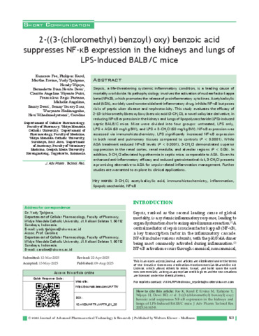 Foe, Kuncoro, Martha, Ervina and Yudy, Tjahjono (2025) 2‑((3‑(chloromethyl) benzoyl) oxy) benzoic acid suppresses NF‑κB expression in the kidneys and lungs of LPS‑Induced BALB/C mice. Journal of Advanced Pharmaceutical Technology & Research, 16 (3). pp. 163-168. ISSN 0976-2094