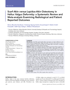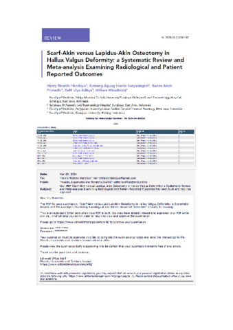 Handoyo, Henry Ricardo, Suryaningrat, Komang Agung Irianto, Primadhi, Andri, Aditya, Rafif Ulya and Wiradinata, William (2025) Scarf-Akin versus Lapidus-Akin Osteotomy in Hallux Valgus Deformity: a Systematic Review and Meta-analysis Examining Radiological and Patient Reported Outcomes. Muscles, Ligaments and Tendons Journal, 15 (2). pp. 130-137. ISSN 2240-4554
