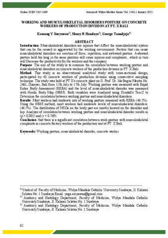 Suryawan, Komang Y., Handoyo, Henry Ricardo and Tanudjaja, George (2021) Working and Musculoskeletal Disorders Posture on Concrete Workers of Production Division at PT. X Bali. Journal of Widya Medika Junior, 3 (1). pp. 62-68. ISSN 26561409