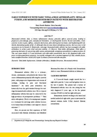 Handoyo, Henry Ricardo and Samsudin, Kevin (2025) Early Experience With Taric Total Ankle Arthroplasty, Ubtalarfusion, and Modified Brostrom in Patients With Rheumatoidarthritis. Journal of Widya Medika Junior, 7 (1). pp. 59-63. ISSN 26561409