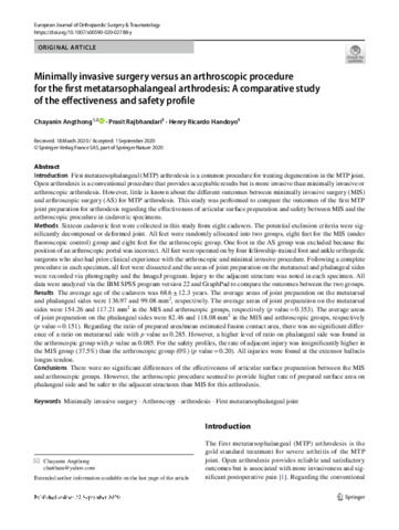 Angthong, Chayanin, Rajbhandari, Prasit and Handoyo, Henry Ricardo (2021) Minimally invasive surgery versus an arthroscopic procedure for the first metatarsophalangeal arthrodesis: A comparative study of the effectiveness and safety profile. European Journal of Orthopaedic Surgery and Traumatology, 31 (3). pp. 417-501. ISSN pISSN: 16338065, eISSN: 14321068