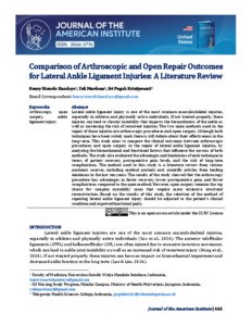 ateral ankle ligament injury is one of the most common musculoskeletal injuries, especially in athletes and physically active individuals. If not treated properly, these injuries can lead to chronic instability that impacts the biomechanics of the ankle as well as increasing the risk of recurrent injuries. The two main methods used in the repair of these injuries are arthroscopic procedures and open surgery. Although both techniques have been widely used, there is still debate about their effectiveness in the long term. This study aims to compare the clinical outcomes between arthroscopic procedures and open surgery in the repair of lateral ankle ligament injuries, by analyzing the biomechanical and functional factors that influence the success of both methods. The study also evaluated the advantages and limitations of each technique in terms of patient recovery, postoperative pain levels, and the risk of long-term complications. The method used in this study is a literature review from various academic sources, including medical journals and scientific articles from leading databases in the last ten years. The results of the study showed that the arthroscopy procedure has advantages in faster recovery, lower postoperative pain, and fewer complications compared to the open method. However, open surgery remains the top choice for complex instability cases that require more extensive structural reconstruction. Based on the results of this study, the selection of the method of repairing lateral ankle ligament injury should be adjusted to the patient's clinical condition and expected functional goals.