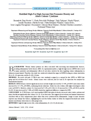 Novita, Bernadette Dian, Tjahjono, Yudy and wedharga, I Gede Putu (2025) Modified High-Fat High-Sucrose Diet Promotes Obesity and Alters Colonic Cytokines. The Indonesian Biomedical Journal, 17 (5). pp. 456-464. ISSN 2355-9179