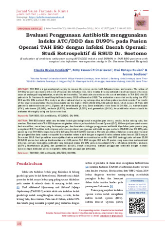 : TAH BSO adalah salah satu tindakan bedah ginekologi untuk menghilangkan uterus, serviks, kedua tabung tuba, dan ovarium. Tindakan bedah TAH BSO dapat meningkatkan risiko terjadinya Infeksi Daerah Operasi (IDO). IDO menjadi penyebab utama dari morbiditas, rawat inap yang berkepanjangan, dan kematian sehingga penggunaan antibiotik diperlukan pada pasien yang mengalami IDO. Penelitian ini bertujuan untuk mengevaluasi penggunaan antibiotik dengan metode ATC/DDD dan DU 90% pada pasien operasi TAH BSO dengan kasus IDO di Ruang Merak RSUD Dr. Soetomo. Metode penelitian dilakukan secara observasional dan pengambilan data secara retrospektif berdasarkan rekam medik dengan mengambil waktu selama bulan Januari 2015 sampai Desember 2018. Hasil penelitian menunjukkan bahwa antibiotik metronidazol memiliki nilai DDD tertinggi yaitu sebesar 25,00 DDD/100 pasien-hari artinya diestimasikan dari 100 pasien TAH BSO dengan IDO ada 25 pasien yang menerima metronidazol 1,5 gram per hari. Sedangkan antibiotik yang termasuk dalam DU 90% yaitu metronidazol (47%), seftriakson (18,16%), amikasin (8,87%), levofloksasin (8,01%), dan gentamisin (6,41%). Untuk selanjutnya, evaluasi penggunaan antibiotik dengan metode Gyssens dapat dilakukan untuk mengetahui ketepatan penggunaan antibiotik.