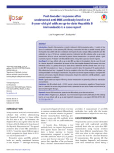 Pangemanan, Lisa and Budiyanto, Budiyanto (2025) Post-booster response after undetected anti-HBS antibody level in an 8-year-old girl with an up-to-date Hepatitis B immunization: a case report. Indonesia Journal of Biomedical Science (IJBS), 19 (2). pp. 87-91. ISSN eISSN: 20854773, eISSN: 32022906