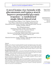 Wilianto, Yufita Ratnasari, Tjahjono, Yudy, Foe, Kuncoro, Wijaya, Sumi, Ervina, Martha, Setiadi, Diga Albrian, Wihadmadyatami, Hevi, Dewi, Bernadette Dian Novita and Wijaya, Hendy (2024) A Novel Konjac Rice Formula With Glucomannan and Tapioca Starch Improve Postprandial Glycemic Response - A Randomized Single-Blind Clinical Trial. Nutririon and Food Science, 54 (5). pp. 1437-1450. ISSN 0034-6659