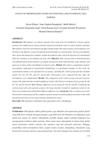 Wijono, Steven, Parengkuan, Irene Lingkan, Morina, Shella, Supit, Vincentius Diamantino, Jaya, David Karunia, Wicaksono, Leonardo Suryanto and Iskandar, Michael Christian (2022) Effect of Microplastic Intake on Intestinal and Pancreatic Cell Damage. JURNAL WIDYA MEDIKA, 8 (2). pp. 116-131. ISSN pISSN: 2338-0373 eISSN: 2623-2723