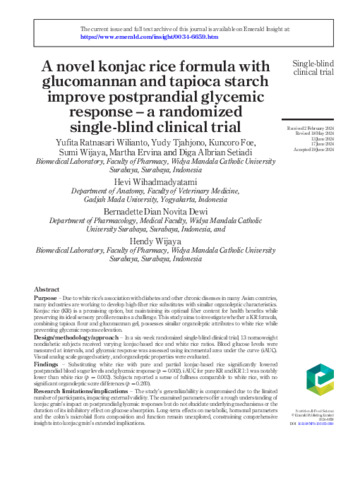 Wilianto, Yufita Ratnasari, Tjahjono, Yudy, Wijaya, Sumi and Wijaya, Hendy (2024) A novel konjac rice formula with glucomannan and tapioca starch improve postprandial glycemic response – a randomized single-blind clinical trial. nutrition and food science, 54 (8). pp. 1437-1450. ISSN 0034-6659