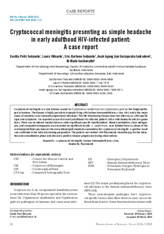 Tedyanto, Cecilia Putri, Wihanto, Laura, Tedyanto, Eric Hartono, Indradewi, Anak Agung Ayu Suryapraba and Susilawathi, Ni Made (2024) Cryptococcal meningitis presenting as simple headache in early adulthood HIV-infected patient: A case report. Romanian JouRnal of neurology, 23 (1). pp. 78-82. ISSN p-ISSN: 18438148, e-ISSN: 20696094