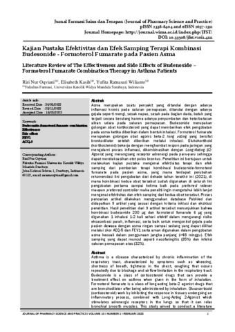 Asma merupakan suatu penyakit yang ditandai dengan adanya inflamasi kronis pada saluran pernapasan, ditandai dengan adanya gejala seperti mengi, sesak napas, sesak pada bagian dada, batuk yang terjadi secara berulang karena adanya penyumbatan dan keterbatasan aliran udara pada saluran pernapasan. Budesonide merupakan golongan obat kortikosteroid yang dapat memberikan efek pengobatan pada asma ketika diberikan dalam bentuk inhalasi. Formoterol fumarate merupakan golongan obat agonis beta-2 long acting yang bersifat bronkodilator setelah diberikan melalui inhalasi. Glukokortikoid (kortikosteroid) bekerja dengan menghambat respons pada jaringan yang mengalami proses inflamasi, dikombinasikan dengan Long-Acting β2-Agonist yang merangsang reseptor adrenergik pada paru-paru sehingga dapat merelaksasikan otot polos bronkus. Penelitian ini bertujuan untuk melakukan kajian pustaka mengenai efektivitas terapi dan efek samping dari pemberian terapi kombinasi budesonide–formoterol fumarate pada pasien asma, yang mana terdapat perubahan rekomendasi lini pengobatan dari dekade tahun terakhir ini (2021), di mana kombinasi kedua obat tersebut sudah digunakan di seluruh lini pengobatan asma sampai kelima baik pada preferred reliever maupun preferred controller karena memberikan efektivitas yang lebih baik terhadap pengobatan dan efek samping dari kedua obat tersebut. Proses pengumpulan artikel dilakukan menggunakan database PubMed dan Google Scholar, dengan 9 artikel yang sesuai dengan kriteria inklusi dan eksklusi penelitian. Hasil penelitian dari 9 artikel tersebut menunjukkan bahwa kombinasi budesonide 200 µg dan formoterol fumarate 6 µg yang diberikan 1 inhalasi 1–2 kali sehari efektif dalam mengurangi risiko eksaserbasi asma, inflamasi, serta memperlihatkan gejala pada pasien asma dewasa, sementara efektivitasnya dapat dilihat melalui skor ACQ-5 dan FEV1 serta aman digunakan dalam pengobatan asma kecuali dalam penggunaan jangka panjang (>48 minggu). Efek samping yang dapat muncul seperti nasofaringitis (35%) dan infeksi saluran pernapasan atas (32%).