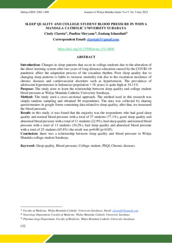 Clareta, Cindy, Meryana, Meryana and Isbandiati, Endang (2023) Sleep Quality and College Student Blood Pressure in Widya Mandala Catholic University Surabaya. Sleep Quality and College Student Blood Pressure in Widya Mandala Catholic University Surabaya, 5 (3). pp. 132-137. ISSN 26561409