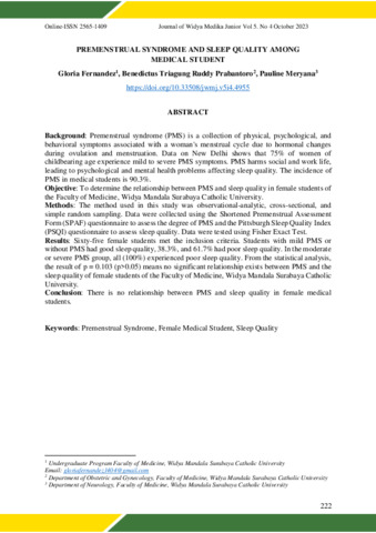 Fernandez, Gloria, Prabantoro, Benedictus Triagung Ruddy and Meryana, Pauline (2023) Premenstrual syndrome and sleep quality among medical student. Journal of Widya Medika Junior, 5 (4). pp. 222-228. ISSN 26561409