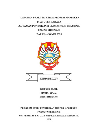 Sintia, Sintia (2025) Laporan praktek kerja profesi apoteker di Apotek Pahala Jl. Taman Pondok Jati Blok C no. 2, Geluran, Taman Sidoarjo 7 April - 10 Mei 2025. Project Report (PKL, PKIPP, Magang D3, Praktik Kerja Profesi Apoteker, Profesi Guru, Profesi Ners dan Profesi Insiyur). Faculty of Pharmacy, Surabaya. (Submitted)